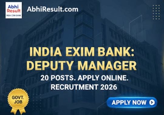 Short Description: India Exim Bank Deputy Managers Online Form 2026 is now live on the official website. Therefore, eligible candidates can apply online within the given time limit. Moreover, this recruitment provides a great opportunity for experienced professionals to join India Exim Bank at a senior level. In addition, important details such as eligibility criteria, age limit, selection process, and salary structure are available in the official notification. Finally, applicants are advised to complete the online form before the last date and visit Abhi Result regularly for admit card, exam date, result, and further updates.